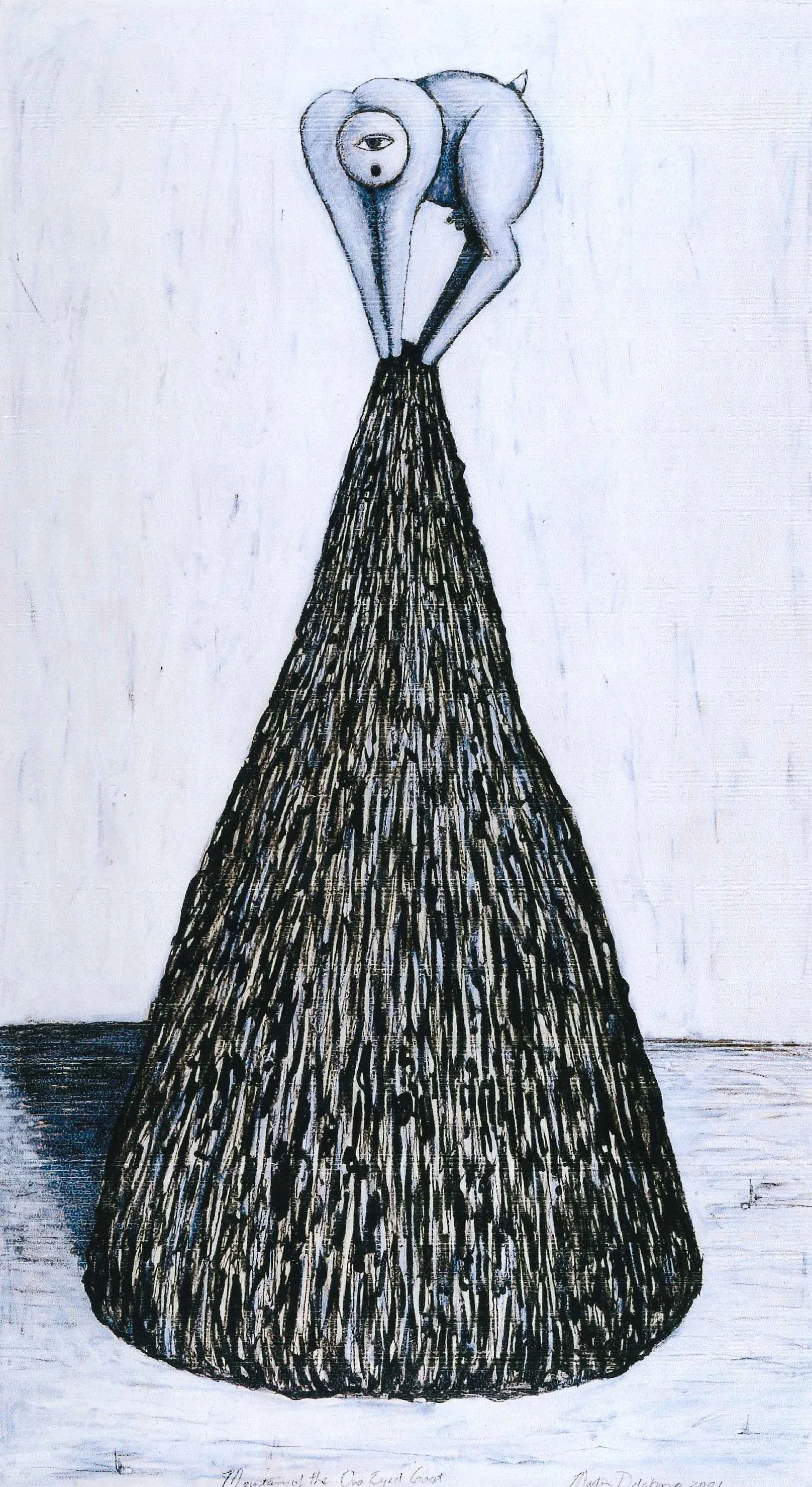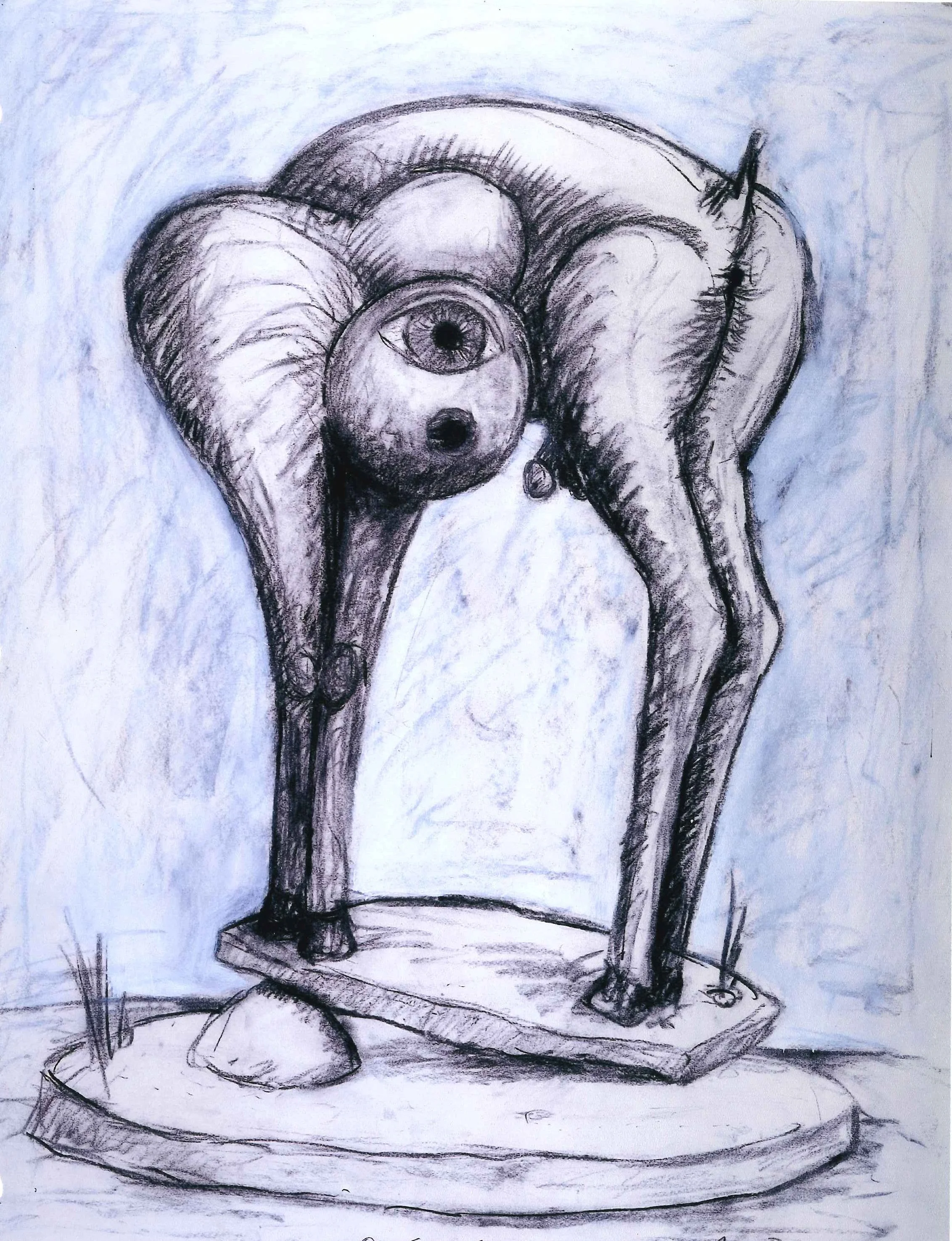 In the charcoal and acrylic on paper study Untitled [2], the precarious balance of the goat is suggested by the goat’s stance on a flat rock, propped at the left by an approximately hemispherical stone, and resting on a larger flat rock. Both in the large charcoal and acrylic drawing Untitled [4], and in the sculpture The Mountain of the One-Eyed Goat, the device of the precariously balanced flat rock is absent, with the locus of precarious balance shifted to the closely spaced feet of the goat itself at the point of the pinnacle. Indeed, the conical convergence of the legs of the goat to the closely spaced feet are formally the inverse of the conical form of the mountain; the forms of the mountain and the legs converging together suggest the center of an hourglass. This nexus of spatial convergence suggests a correlative nexus of temporal convergence, analogous to Nietzsche’s notion of the Augenblick: between past and future, between retention and protention, the goat is poised at the moment of the Now. 8 The handwritten note in the mixed media study Untitled [3] has: